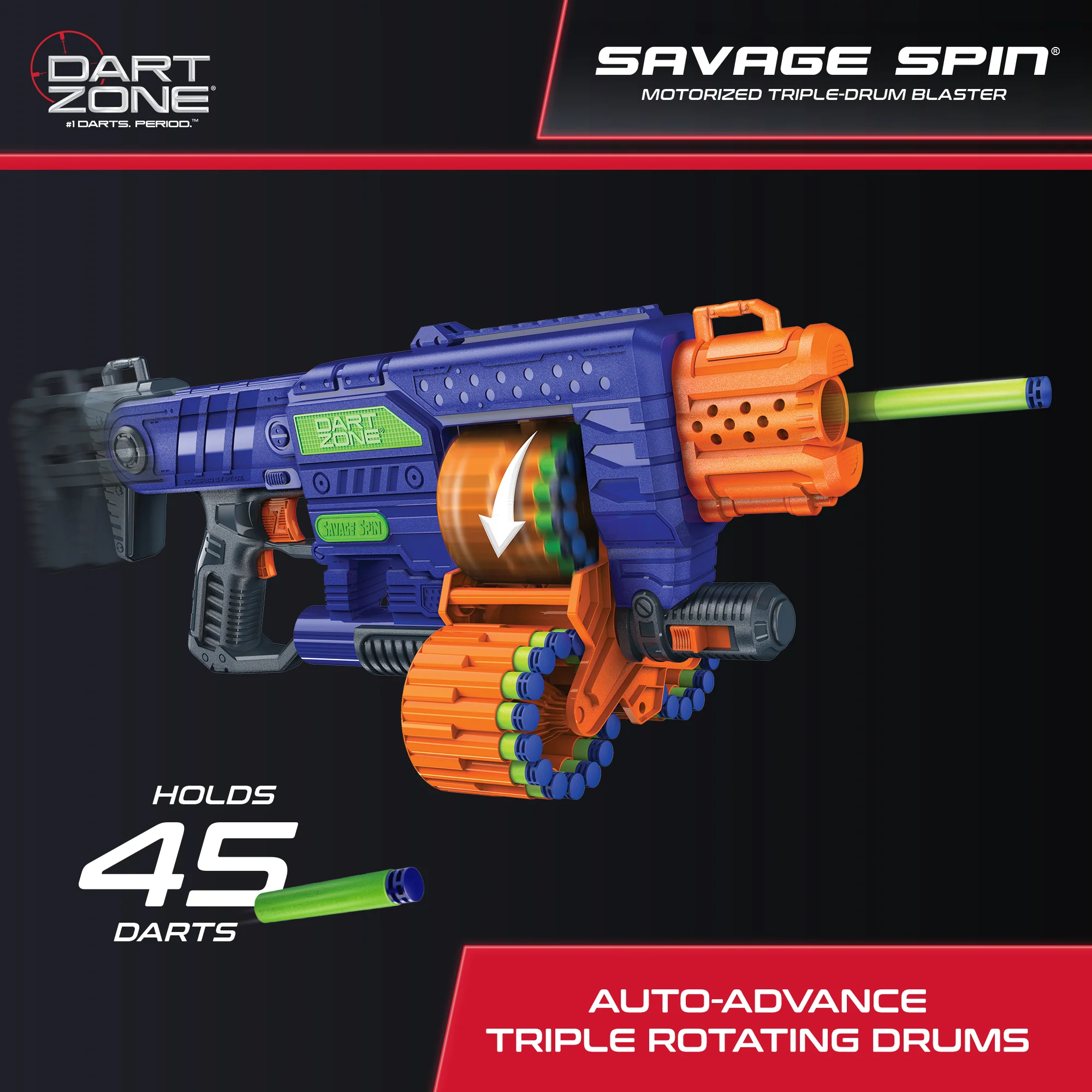 Take aim with the Dart Zone Savage Spin foam dart blaster—the ultimate triple-drum launcher for high-energy backyard battles. This motorized blaster comes packed with a 45-dart capacity and launches darts up to 80 feet, delivering fast, powerful, and action-packed play. The Savage Spin features three auto-advancing rotating drums for nonstop blasting. Forget frequent reloads—just press the Rev-Trigger to power up the flywheels, then fire with the primary trigger for rapid, continuous shots. Comfort meets control with the telescoping tactical stock, which extends up to 2 feet for a customized, stable fit. Whether you're defending your turf or making a move, this adjustable stock adds support when it counts. Included in the set are 45 Dart Zone Waffle Tip Darts, designed for accuracy and smooth flight. Made from soft foam and featuring a textured tip, these darts are compatible with all Dart Zone blasters and most standard dart blasters from leading brands. Whether you're playing solo or in a team, the Savage Spin delivers screen-free fun that keeps the action going. With its bold look and high-capacity drum system, it’s built for everything from backyard battles to birthday parties. This blaster is perfect for players who want to stay in the game longer—and blast harder.